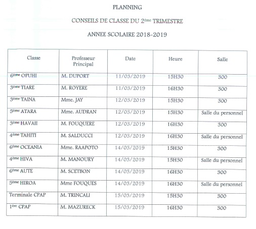 ArticleDates des conseils de classe 2e trimestre14 février 2019Les conseils de classe du premier trimestre démarrent le 11 mars prochain suivant le planning ci-après :