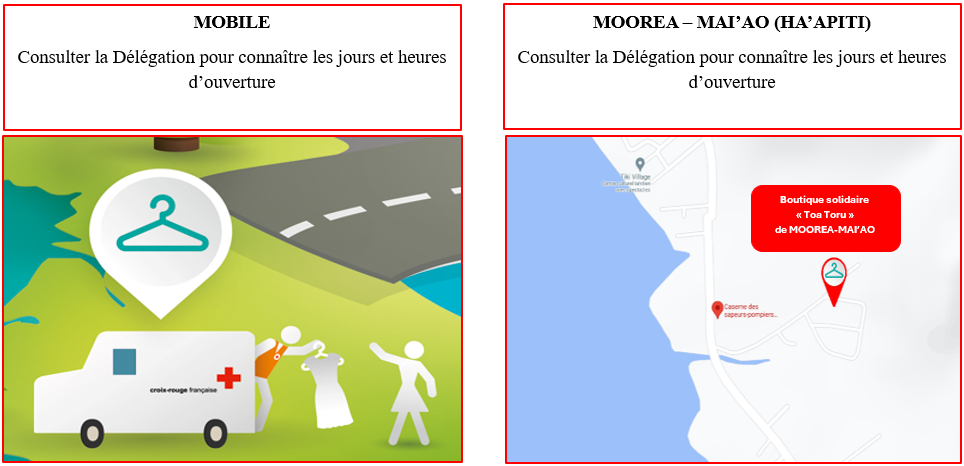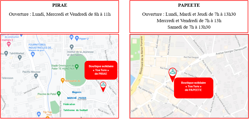 Nous avons trois boutiques solidaires fixes, la boutique solidaire à Pirae, la boutique solidaire à Papeete, la boutique solidaire à Moorea et la boutique solidaire mobile pour les communes de la presqu’île.