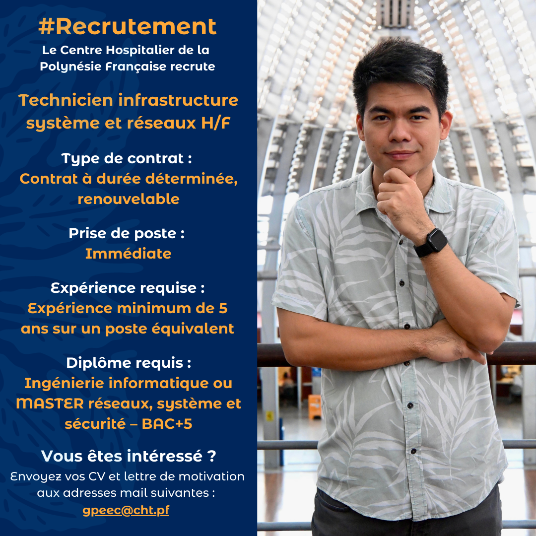 L’article Recrutement – Technicien infrastructure système et réseaux H/F est apparu en premier sur Centre Hospitalier de Polynésie française.